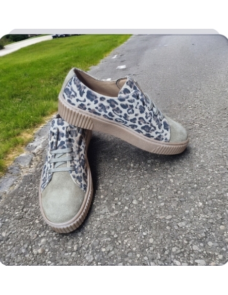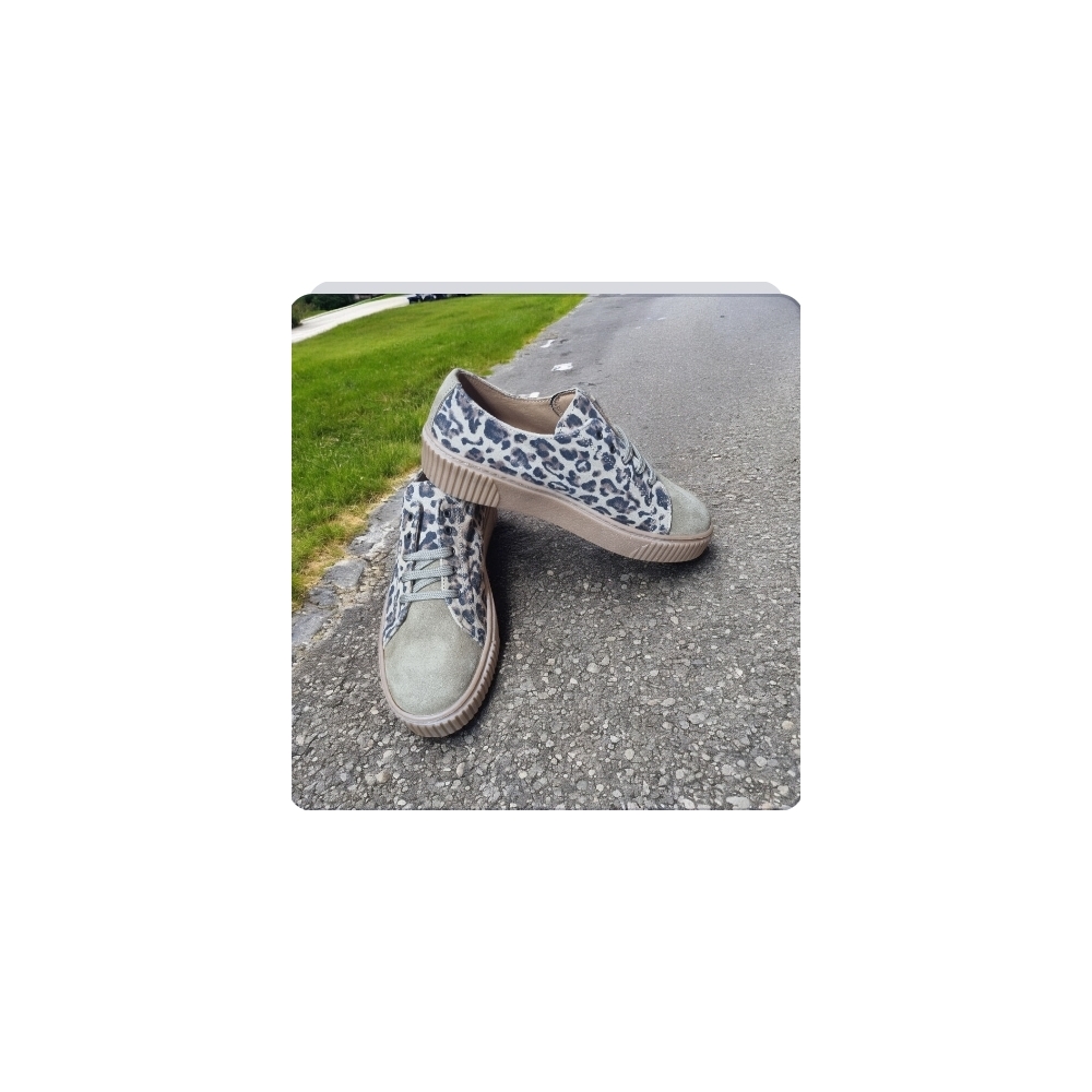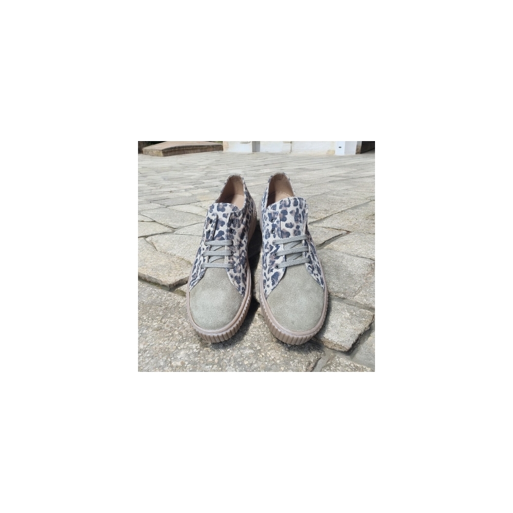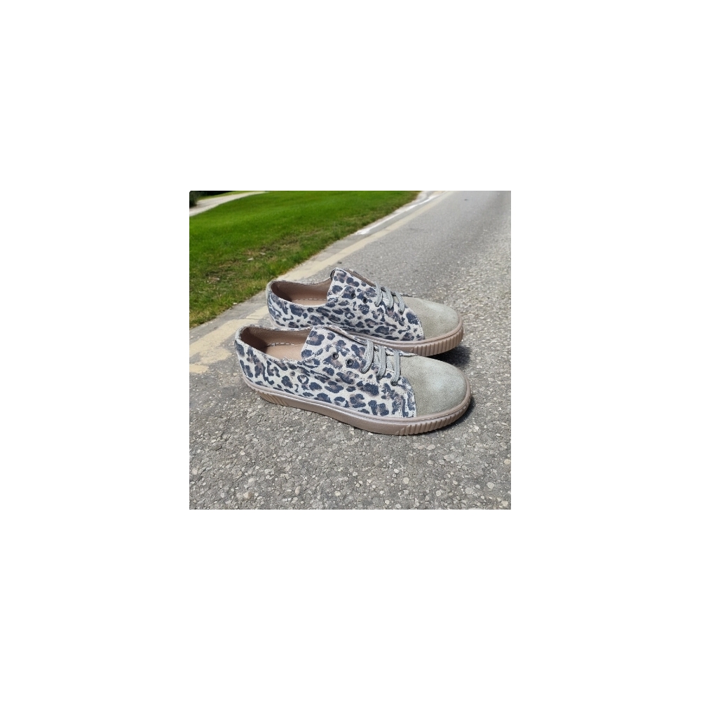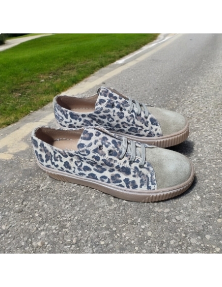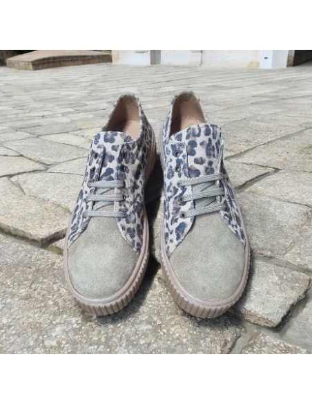 Sneakers bajos en piel de serraje con detalles de estampado leopardo, forro interior de piel y suela antideslizante. Estilo casual y cómodo para el día a día.